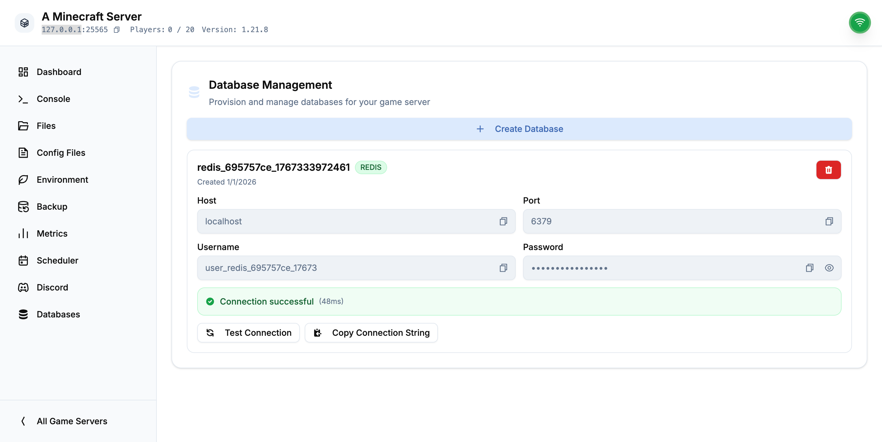 Automatically provision and manage databases for your game servers. No technical knowledge required - just click, create, and connect.